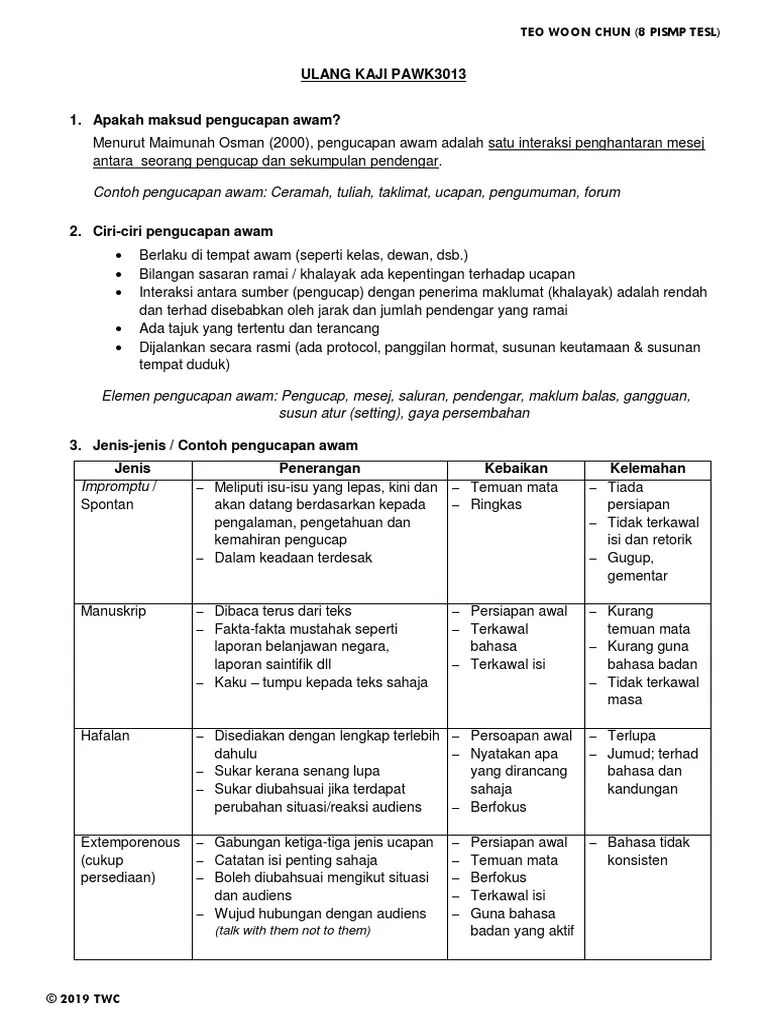 Pilih tajuk yang sesuai 1. Gangguan semasa pengucapan awam · pantun sebagai pelengkap wacana pengucapan awam · teknik pengucapan awam yang . Anda takut hendak bercakap di khalayak ramai? Kepentingan amalan berbudi bahasa 3. ٦ ذو القعدة ١٤٣٨ هـ. Sebagai contoh, dan bukannya tidak sakit harus mengatakan nasib baik dan. Apa yang boleh menjadi topik yang menarik untuk pengucapan awam dalam . Tajuk pengucapan awam (contoh isu semasa yang sesuai & menarik). ١٤ ذو الحجة ١٤٤٢ هـ. Aku calon pegawai penerangan s41 2017 yang diadakan di politeknik port dickson. Faedah penggunaan media sosial 2.